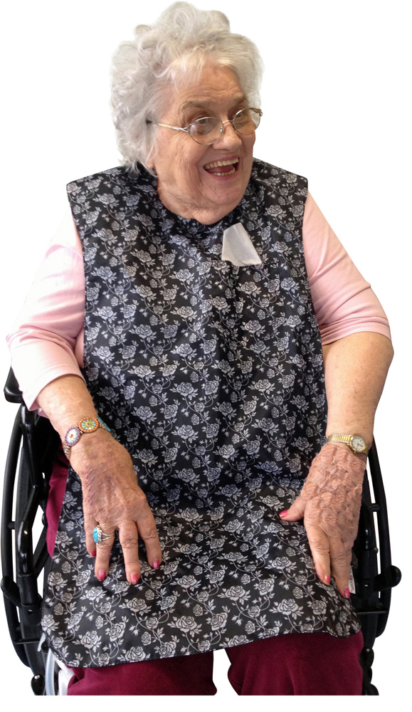 Shows optional $2 clip cord for use as an apron. Not needed for dining